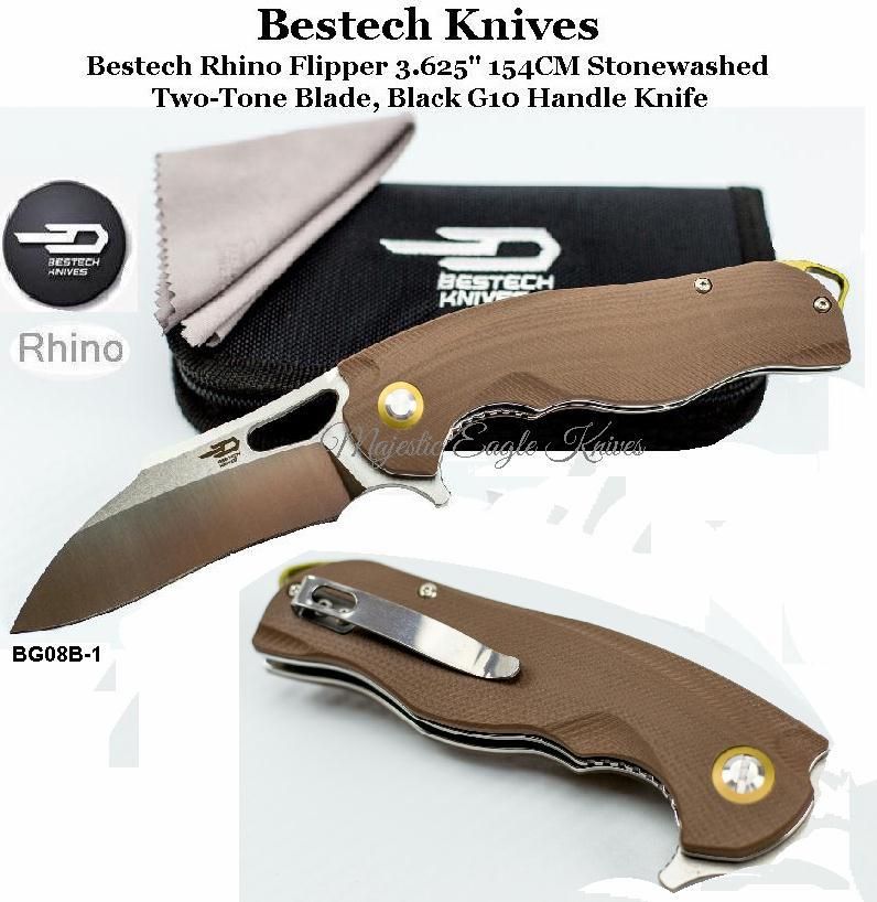 Bestech Knives BG08B-1 Bestech Rhino Flipper Knife 3.625" 154CM Stonewashed Two-Tone Blade, Beige G10 Handle Knife! The BG08B-1 flipper is dubbed the Rhino, and it's a name that fits. This beefy flipper not only fully fills your hand when in use it is comfortable doing so. The shape and size mean it won't back down from any task you put in front of it. The 3.625" recurve blade is made from 154CM stainless steel with a stonewashed two-tone finish. The action riding on ceramic ball bearings is buttery smooth and the lockup is nice and tight. The handle is made from G10 with a slight texture to it to increase grip while in use. You can use this knife for anything from self-defense to opening mail and everything in between. Includes a black nylon zipper pouch and polishing cloth.