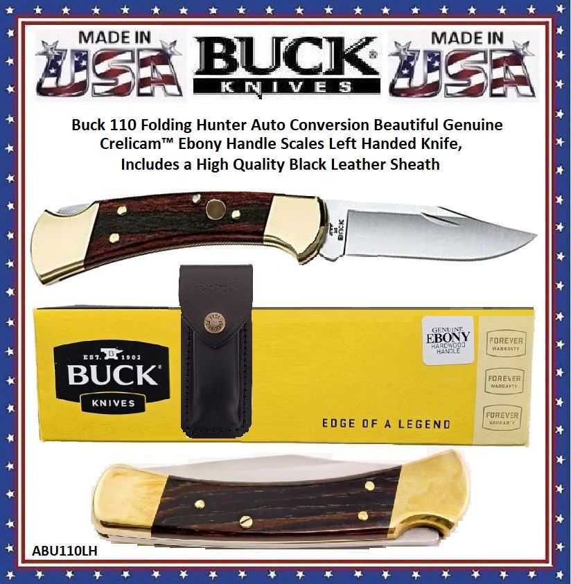 Buck 110 Folding Hunter Auto Conversion Beautiful Genuine Crelicam™ Ebony Handled Left Handed Knife & Black Leather Sheath! This classic American Made Buck Original Folding Hunter 110 Automatic Double Action Knife. This knife has been converted aftermarket so when you push the button the knife opens automatically. It also opens manually, hence the double action. The knife has beautiful Crelicam™ Ebony Scales. The best Buck craftsmanship that you would expect. This knife comes with a Made in the USA, Leather sheath. It is brand new although it was converted aftermarket. The knife also has brass bolsters and a brass firing pin. Note: Since this is an aftermarket conversion, the knife is not covered under any warranty.