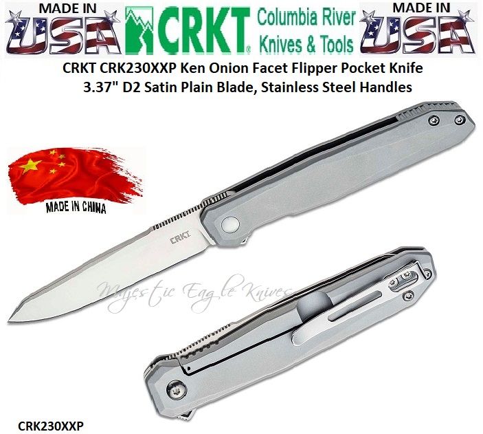Columbia River Knives CRK230XXP CRKT Ken Onion Facet Flipper Pocket Knife 3.37" D2 Satin Plain Blade, Stainless Steel Handles! Ken Onion is known for his sleek and practical designs, and the K230XXP is no exception. The angles and facets of the handle complement the slim design and angular shape of the blade. Equipped with CRKT's IKBS ball bearing pivot system and an assisted open mechanism, this blade rockets open like you wouldn't believe. The blade is made from sturdy D2 steel for exceptional edge retention and a satin finish. The frame lock utilizes a thick lock bar to secure the blade firmly. With the addition of a deep carry pocket clip, the Facet is easy to carry without drawing attention to it or getting in the way.