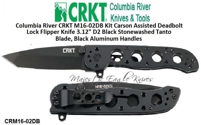 Columbia River Knives CRM16-02DB CRKT Kit Carson Assisted Deadbolt Lock Flipper Pocket Knife 3.12" D2 Black Stonewashed Tanto Plain Blade, Black Aluminum Handles! The M16 is the most popular series that CRKT has ever seen. They're humbled to do right by the revered Kit Carson with this iteration of a legendary tactically-inspired everyday carry folding knife. This one is more than just a fresh take on a classic. It's a true tribute to one of the greats.The late Kit Carson designed this and many of his other groundbreaking knives in his shop in Vine Grove, Kentucky. Kit's lasting legacy comes from his influence on the knife industry's known for popularizing the flipper which is now a household component. In addition, he's also remembered for his esteemed ranking as a Master Sergeant and his high-profile membership in the Cutlery Hall of Fame. The M16-02DB keeps all we love of Kit's original tactically-inspired everyday carry folding knife and adds a D2 tanto blade complete with a durable black oxide finish. With its new deadbolt lock, it's securely held in place in the midst of whatever job you put in front of it while the aluminum handle bored with five holes keeps it clean and light. With this M16 reimagining, CRKT is honoring a legend the best way they know-how.