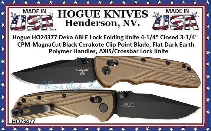 HOUGE KNIVES > Hogue HO24377 Deka ABLE Lock Folding Knife 4-1/4" Closed 3-1/4" CPM-MagnaCut Black Cerakote Clip Point Blade, Flat Dark Earth Polymer Handles, AXIS/Crossbar Lock Knife