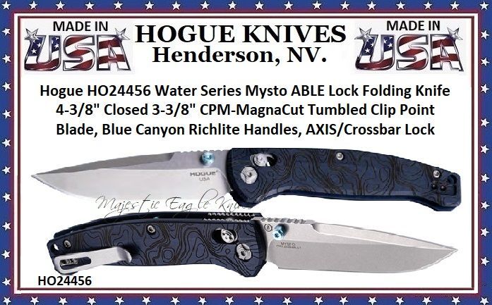 Hogue HO24456 Water Series Mysto ABLE Lock Folding Knife 4-3/8" Closed 3-3/8" CPM-MagnaCut Tumbled Clip Point Blade, Blue Canyon Richlite Handles, AXIS/Crossbar Lock! Unleash the power of precision with the Hogue Mysto Fire, a striking new addition to the Mysto platform. Inspired by ocean tones and the natural element of water, this everyday carry (EDC) knife is more than just a tool - it's a statement.Crafted with a Blue Canyon Richlite frame, the Mysto Water features a unique laser-engraved topographic pattern. Richlite is a Class A rated, fire-resistant material known for its impressive strength, making it a reliable choice for the demands of daily use. Designed by Scott Bruhns, the Mysto Water boasts a 3.4-inch CPM Magna Cut steel blade with a rugged tumbled finish, ensuring premium cutting performance and durability. Experience lightning-fast deployment and rock-solid security with Hogue's renowned ABLE Lock mechanism. Attention to detail sets the Mysto Water apart. Blue anodized titanium thumb studs and backspacers add a touch of refined elegance and robust functionality. Weighing in at a mere 2.5 ounces, this pocket knife delivers incredible strength without the bulk, making it the ideal EDC companion.Each Mysto Water also includes a Bruhns Design Water Element PVC patch, a subtle nod to its mystic inspiration. Every Hogue knife is made in the USA and is backed by three generations of manufacturing expertise.