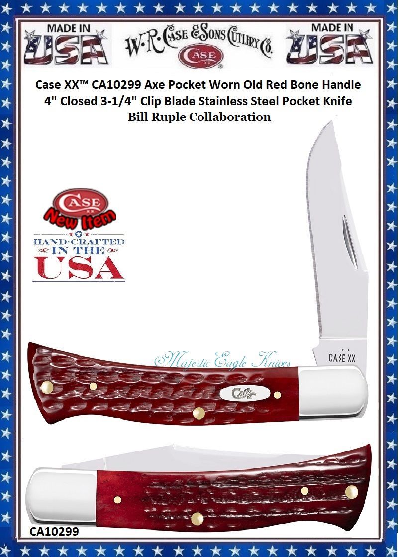 W.R. Case-Sons Cutlery CA10299 Case XX™ Axe Pocket Worn Old Red Bone Handle 4" Closed 3-1/4" Clip Blade Stainless Steel Pocket Knife! This classic American Case Axe Handle is about 4 inches long (folded/closed) and weighs approximately 2.9 ounces. The handle is Pocket Worn Corn Cob jigged Old Red Bone with a Nickel Silver Oval Script Inlay shield. The bolsters are Highly polished Nickel Silver. This knife utilizes a 3 3/8" Locking Clip blade with a plain edge, flat taper grind, and a nail nick. Stamped with pattern number BR61135 SS, the blade material is Tru-Sharp Surgical Stainless Steel with a mirror-polished finish. This Axe Handle is a professional-grade tool that comes with a Limited Lifetime Manufacturer's Warranty and is not designed nor intended to be used on or against humans. So, whether you're hunting for authentic cutlery to collect, a top quality knife to give as a gift, or a superior tool to use,