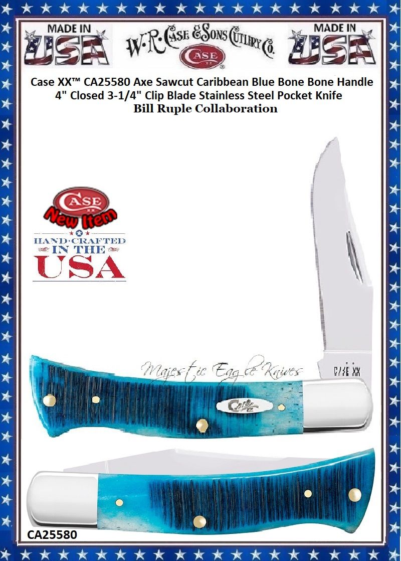 | W.R. Case-Sons Cutlery CA25580 Case XX™ Axe Sawcut Caribbean Blue Bone Handle 4" Closed 3-1/4" Clip Blade Stainless Steel Pocket Knife! This classic American Case Axe Handle is about 4 inches long (folded/closed) and weighs approximately 2.9 ounces. The handle is Sawcut jigged Caribbean Blue Bone with a Nickel Silver Oval Script Inlay shield. The bolsters are Highly polished Nickel Silver. This knife utilizes a 3 3/8" Locking Clip blade with a plain edge, flat taper grind, and a nail nick. Stamped with pattern number BR61135 SS, the blade material is Tru-Sharp Surgical Stainless Steel with a mirror-polished finish. This Axe Handle is a professional-grade tool that comes with a Limited Lifetime Manufacturer's Warranty and is not designed nor intended to be used on or against humans. So, whether you're hunting for authentic cutlery to collect, a top quality knife to give as a gift, or a superior tool to use,