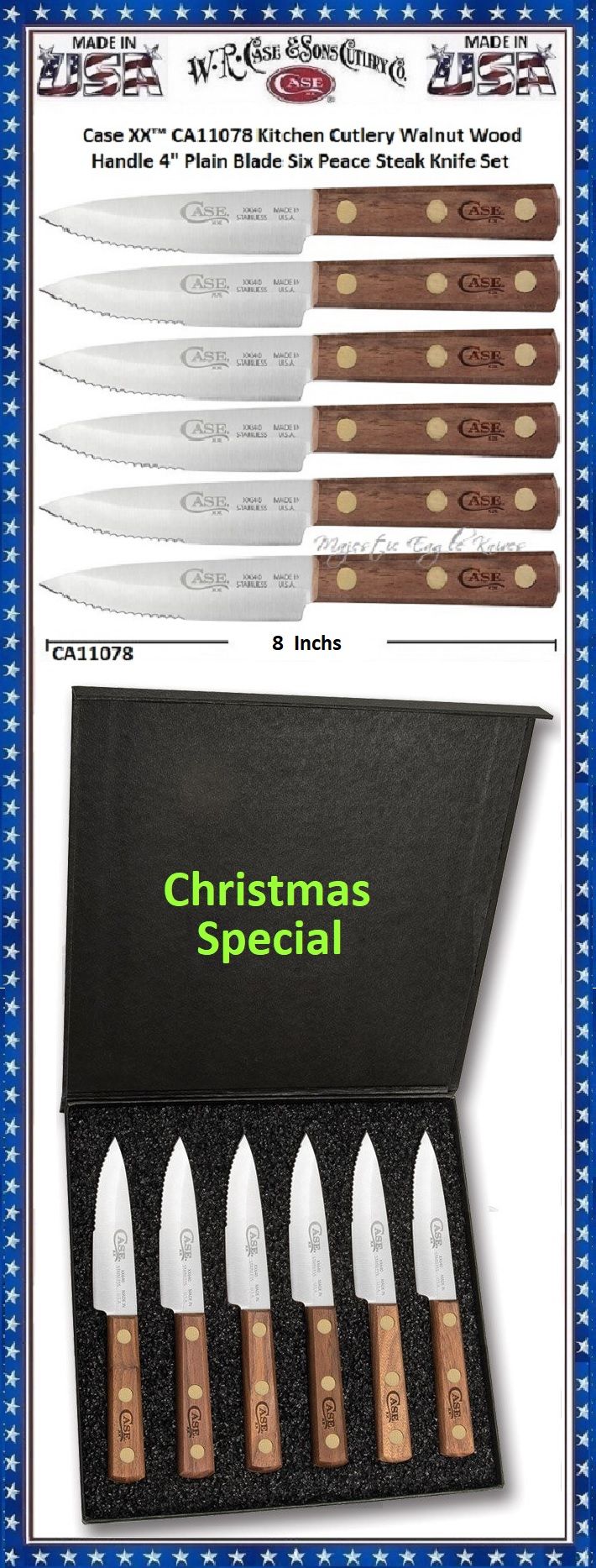 W.R. Case & Sons Cutlery CA11078! This classic American Case 6-piece Steak Knife Set comes with a Limited Lifetime Manufacturer's Warranty. The blade material is Stainless Steel with Satin finish. The handles are smooth Walnut Wood with Brass rivets. This 6-Piece Set comes with a Magnetic Presentation Box So, whether you're hunting for authentic cutlery to collect or top quality knives to give as a gift,