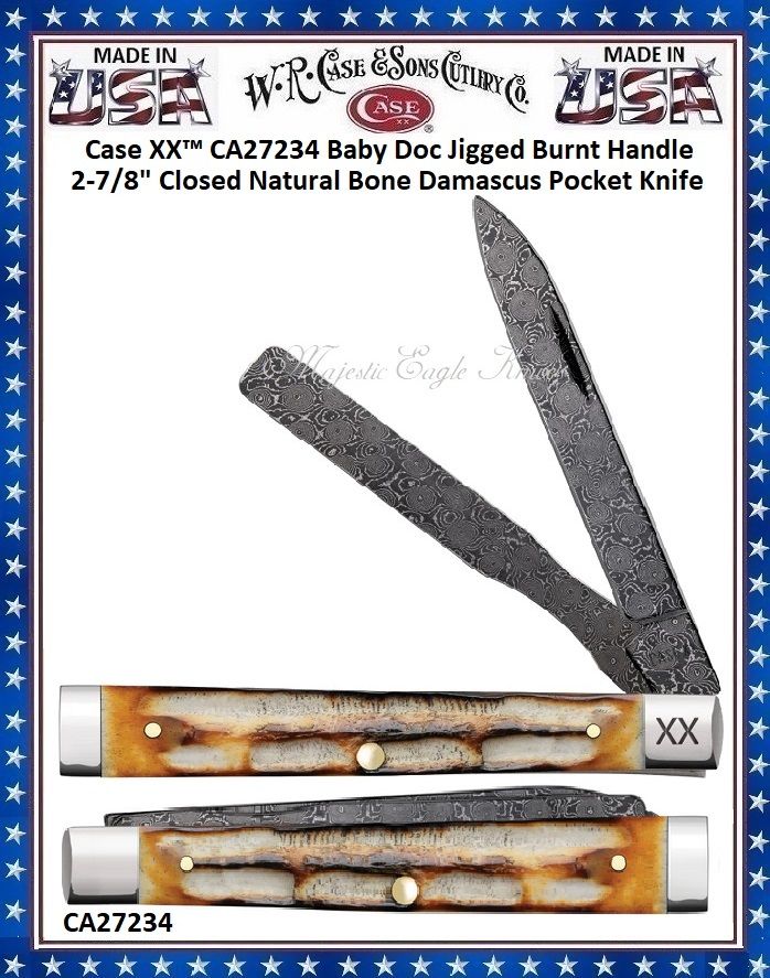 W.R. Case & Sons Cutlery CA27234 Case XX™ Baby Doc Jigged Burnt Bone Handle 2-7/8" Closed Damascus Pocket Knife! This Classic American Case Baby Doc is about 2 7/8 inches long (folded/closed) and weighs approximately 1.2 ounces. The handle is Deep Canyon jigged Burnt Natural Bone. The bolsters are XX Engraved Nickel Silver. This knife utilizes a 2 1/4" Spear point blade and 2 1/4" Spatula blade. Stamped with pattern number 6282SP DAM, the blade material is Damascus Steel. This Baby Doc is a professional-grade tool that comes with a Limited Lifetime Manufacturer's Warranty and is not designed nor intended to be used on or against humans. So, whether you're hunting for authentic cutlery to collect, a top quality knife to give as a gift, or a superior tool to use,