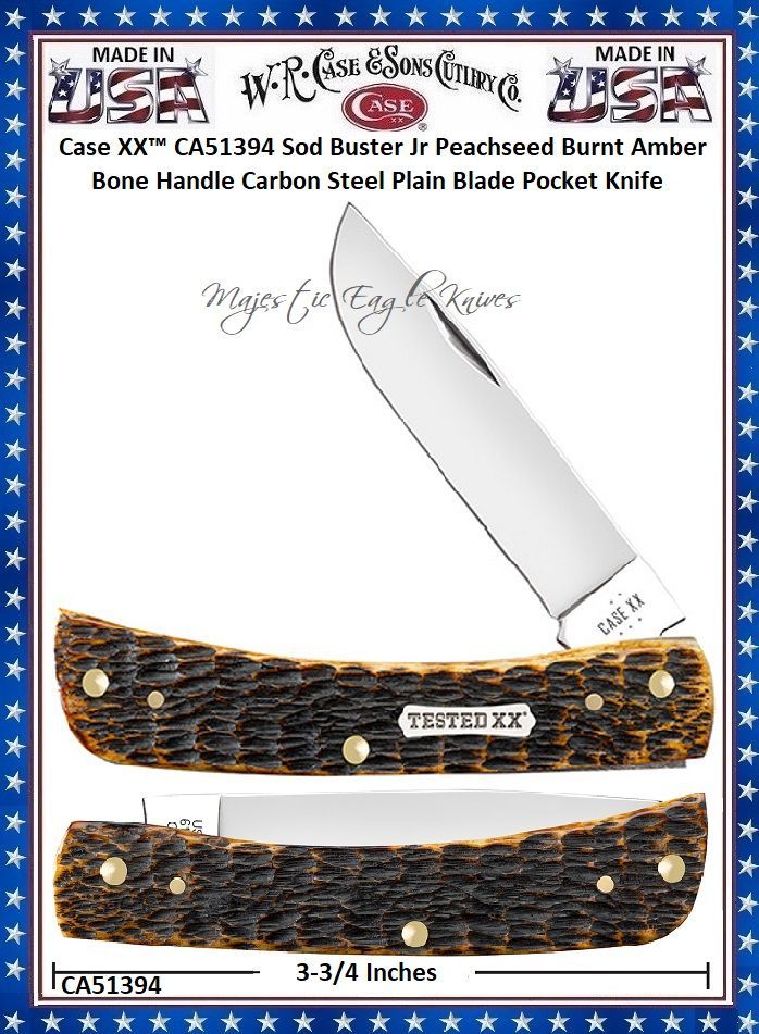 W.R. Case & Sons Cutlery CA51394 Case XX™ Sod Buster Jr Jig Burnt Amber Bone Handle Carbon Steel Pocket Knife! This classic American Case Sod Buster Jr is about 3 3/4 inches long (folded/closed) and weighs approximately 1.9 ounces. The handle is Peachseed jigged Burnt Amber Bone with a Nickel Silver Dogbone Tested XX Inlay shield. The bolsters are Highly polished Nickel Silver. This knife utilizes a 2 7/8" Skinner blade. Stamped with pattern number 6137 CS, the blade material is 1095 Carbon Steel with a mirror-polished finish. Note: Carbon Steel is generally harder than stainless steel, this allows the blade to hold a sharper edge, longer. However, Carbon Steel will corrode/rust if it's not cleaned and oiled regularly. This Sod Buster Jr is a professional-grade tool that comes with a Limited Lifetime Manufacturer's Warranty and is not designed nor intended to be used on or against humans. So, whether you're hunting for authentic cutlery to collect, a top quality knife to give as a gift, or a superior tool to use,
