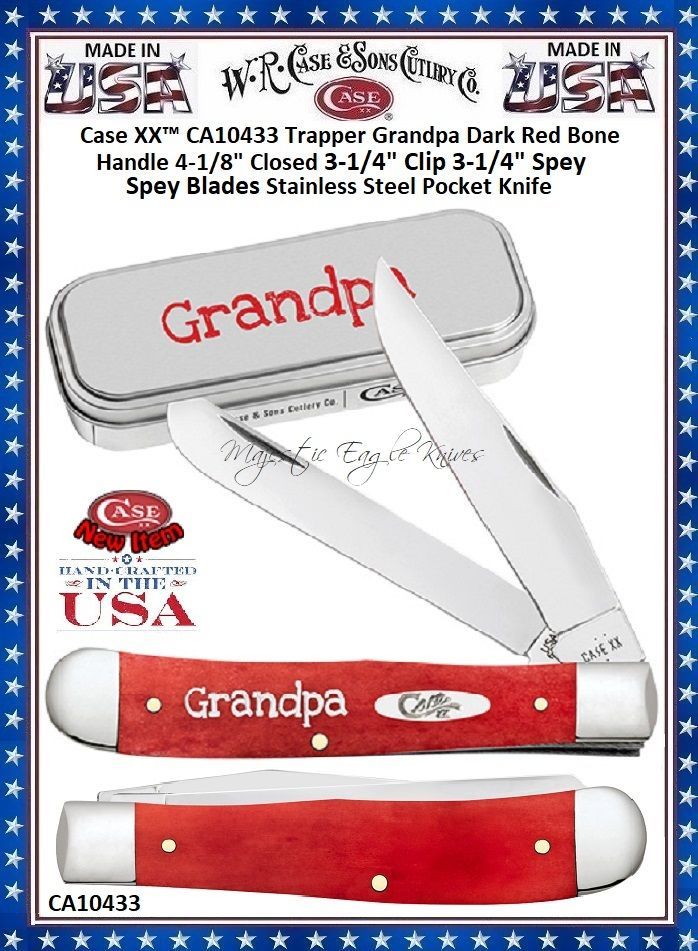 W.R. Case & Sons Cutlery CA10433 Case XX™GRANDPA Trapper Dark Red Bone Handle 4-1/8" Closed 3-1/4" Clip 3-1/4" Spey Blade Stainless Steel Pocket Knife! This Classic American Case Trapper is 4-18 inches long closed and weighs approximately 4.0 ounces. The handle is dark red bone handle 3-3/4" Closed 3-3/4" Clip Plain Blade Tru-Sharp Surgical Stainless Steel. Stamped with pattern number (6254 SS), with a mirror-polished finish. This Trapper is a professional-grade tool that comes with a Limited Lifetime Manufacturer's Warranty. So, whether you're looking for authentic cutlery to collect, a top quality knife to give as a gift, or a superior tool to use,