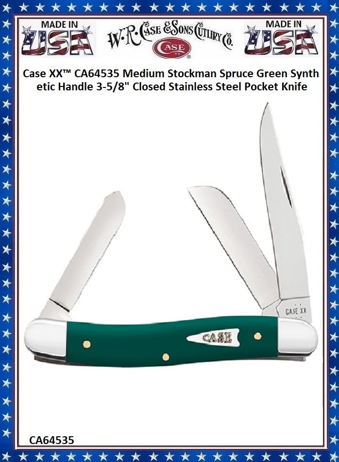 W.R. Case & Son's Cutlery CA64535 Case XX™  Medium Stockman Spruce Green Synthetic Handle 3-5/8" Closed Stainless Steel Blade Pocket Knife! This classic American Case Medium Stockman is about 3 5/8 inches long (folded/closed) and weighs approximately 2.4 ounces. The handle is smooth Spruce Green Synthetic with a Nickel Silver Case Arrowhead Inlay shield. The bolsters are Highly polished Nickel Silver. This knife utilizes a 2 1/2" Clip blade, 2" Sheepsfoot Coping blade and 1 3/4" Spey blade. Stamped with pattern number 4318 SS, the blade material is Tru-Sharp Surgical Stainless Steel with a mirror-polished finish. This Medium Stockman is a professional-grade tool that comes with a Limited Lifetime Manufacturer's Warranty and is not designed nor intended to be used on or against humans. So, whether you're hunting for authentic cutlery to collect, a top quality knife to give as a gift, or a superior tool to use,