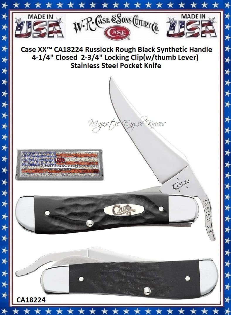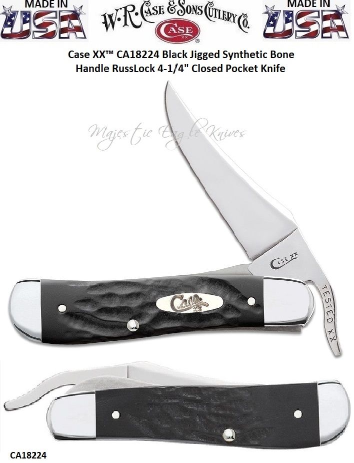 W.R. Case & Sons Cutlery CA18224 Case XX™ Black Jigged Synthetic Bone Handle RussLock 4.25" Closed Pocket Knife!Our nearly indestructible black synthetic handle material meets classic jigging in this reincarnation designed to be just as tough in use and looks as the original "Gum Fuddy" knives which were born out of World War II when more traditional handle materials were scarce. The limited time in which Rough Black knives were originally made makes this handle material one of the most famous in Case history!
