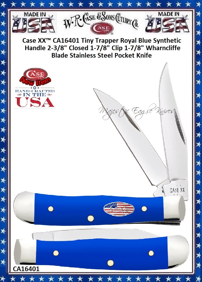 W.R. Case & Sons Cutlery CA16401 Case XX™ Tiny Trapper Royal Blue Synthetic Handle 2-3/8" Closed 1-7/8" Clip 1-7/8" Wharncliffe Blade Stainless Steel Pocket Knife! This classic American Case Tiny Trapper is about 2 3/8 inches long (folded/closed) and weighs approximately 1.0 ounces. The handle is smooth Royal Blue Synthetic with a Nickel Silver Oval Stars & Stripes Inlay shield. The bolsters are Highly polished Nickel Silver. This knife utilizes a 1-7/8" Clip blade and 1-7/8" Wharncliffe blade. Stamped with pattern number 42154W SS, the blade material is Tru-Sharp Surgical Stainless Steel with a mirror-polished finish. This Tiny Trapper is a professional-grade tool that comes with a Limited Lifetime Manufacturer's Warranty and is not designed nor intended to be used on or against humans. So, whether you're hunting for authentic cutlery to collect, a top quality knife to give as a gift, or a superior tool to use,