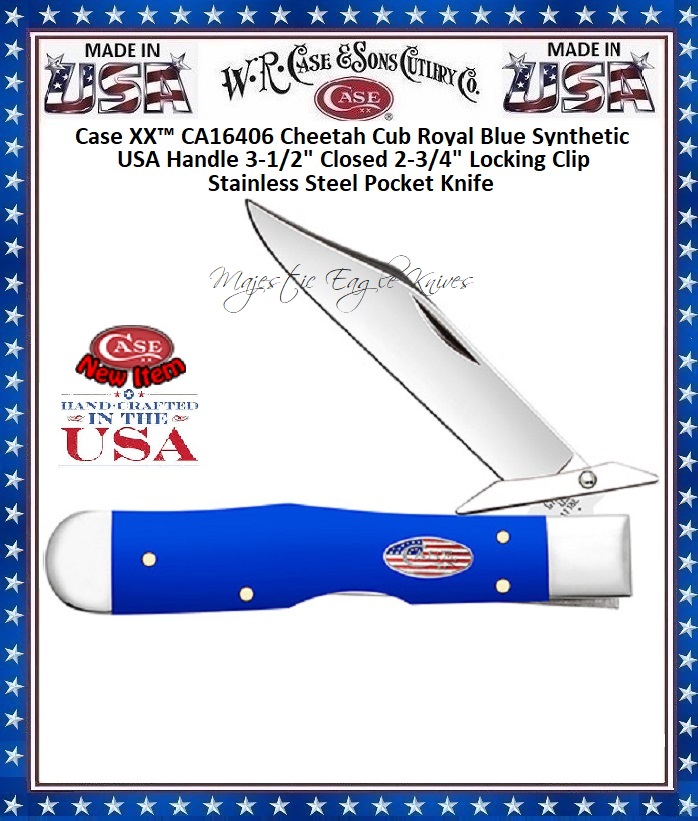 W.R. Case & Sons Cutlery CA16406 Case XX™ Cheetah Cub Royal Blue Synthetic USA Handle 3-1/2" Closed 2-3/4" Locking Clip Stainless Steel Pocket Knife! This classic American Case Cheetah Cub is about 3 1/2 inches long closed and weighs 1.9 ounces. The handle is smooth Royal Blue Synthetic with a Nickel Silver Oval Stars & Stripes Inlay shield. The bolsters are Highly polished Nickel Silver. This knife has a 2-3/4" Locking Clip blade with finger guard. Stamped with pattern number 411 1/2L SS, the blade material is Tru-Sharp Surgical Stainless Steel with a mirror-polished finish. This Cheetah Cub is a professional-grade tool that comes with a Limited Lifetime Manufacturer's Warranty. So, whether you're hunting for authentic cutlery to collect, a top quality knife to give as a gift, or a superior tool to use,