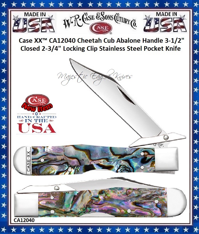 W.R. Case & Sons Cutlery CA12040 Case XX™ Cheetah Cub Abalone Handle 3-1/2" Closed 2-3/4" Locking Clip Blade Stainless Steel Pocket Knife! This classic American Case Cheetah Cub is 3-1/2 inches long closed and weighs 1.9 ounces. The handle is genuine Abalone. The bolsters are Engraved Nickel Silver. This knife has a 2 3/4" Locking Clip blade with finger guard. Stamped with pattern number 811 1/2L SS, the blade material is Tru-Sharp Surgical Stainless Steel with a mirror-polished finish. The knife is presented with a Black Velvet Box. This Cheetah Cub is a professional-grade tool that comes with a Limited Lifetime Manufacturer's Warranty. So, whether you're hunting for authentic cutlery to collect, a top quality knife to give as a gift, or a superior tool to use,