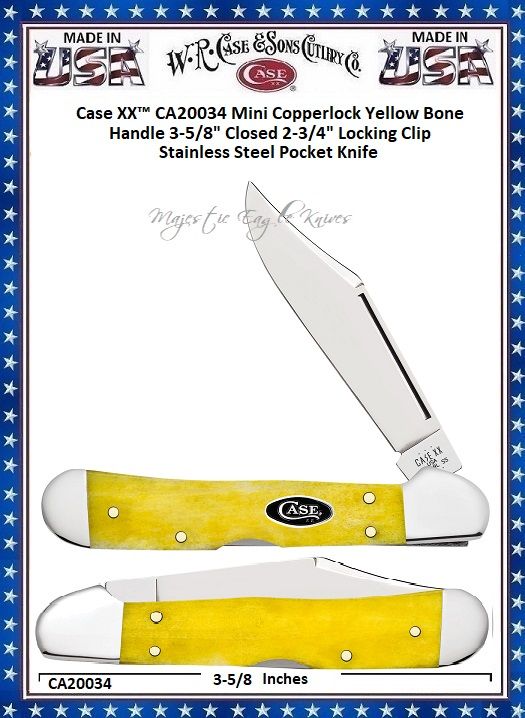 W.R. Case & Sons Cutlery CA20034 Case XX™ Mini Copperlock Yellow Bone Handle 3-5/8" Closed 2-3/4" Case XX™ Locking Clip Stainless Steel Pocket Knife! This classic American Case Mini Copperlock is about 3-5/8 inches long (folded/closed) and weighs approximately 1.9 ounces. The handle is Yellow Bone with an Oval Nickel Silver Black Case Inlay shield. The bolsters are highly polished Nickel Silver. This knife utilizes a 2-3/4" Locking Clip blade. Stamped with pattern number 61749L SS, the blade material is Tru-Sharp Stainless Steel with a Mirror-polished finish. This Mini Copperlock is a professional-grade tool that comes with a Limited Lifetime Manufacturer's Warranty and is not designed nor intended to be used on or against humans. So, whether you're hunting for authentic cutlery to collect, a top quality knife to give as a gift, or a superior tool to use,