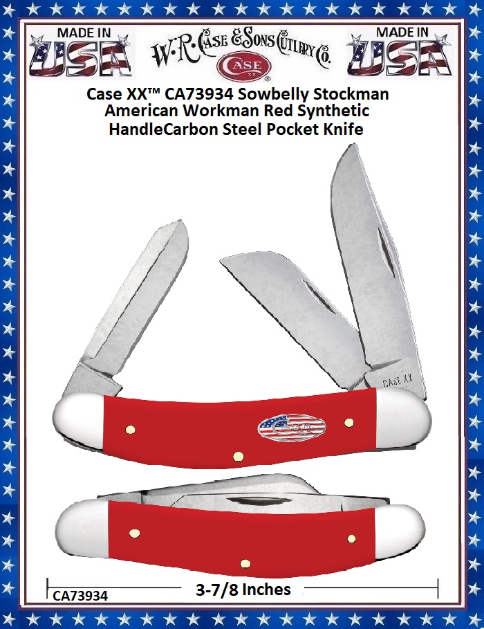 This classic American Case Sowbelly Stockman is about 3 7/8 inches long (folded/closed) and weighs approximately 3.3 ounces. The handle is smooth Red Synthetic with a Nickel Silver Oval Stars & Stripes Inlay shield. The bolsters are Highly polished Nickel Silver. This knife utilizes a 2 3/4" Clip Point blade, 2 1/4" Sheepsfoot Coping blade and 2 1/4" Spey blade. Stamped with pattern number TB4339 CS, the blade material is 1095 Carbon Steel with a mirror-polished finish. Note: Carbon Steel is generally harder than stainless steel, this allows the blade to hold a sharper edge, longer. However, Carbon Steel will corrode/rust if it's not cleaned and oiled regularly. This Sowbelly Stockman is a professional-grade tool that comes with a Limited Lifetime Manufacturer's Warranty and is not designed nor intended to be used on or against humans. So, whether you're hunting for authentic cutlery to collect, a top quality knife to give as a gift, or a superior tool to use,