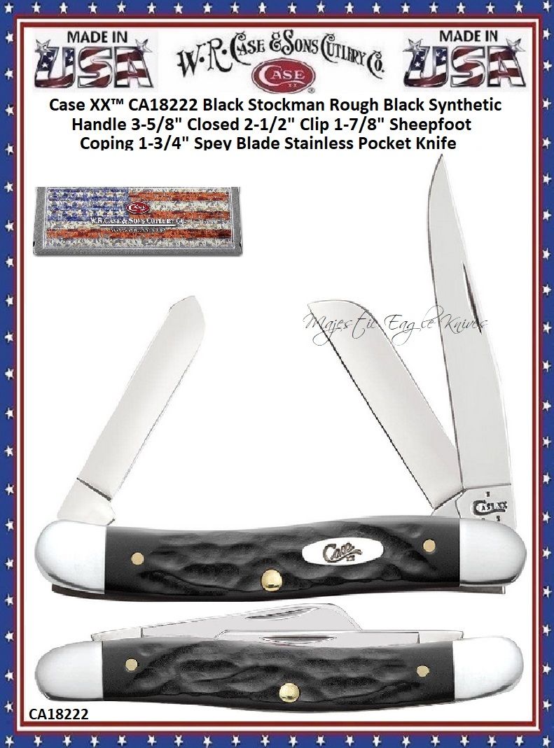 W.R. Case & Sons Cutlery CA18222 Case XX™ Black Jigged Synthetic Bone Handle Medium Stockman 3-5/8" Closed Pocket Knife!Our nearly indestructible black synthetic handle material meets classic jigging in this new reincarnation designed to be just as tough in use and looks as the original "Gum Fuddy" knives which were born out of World War II when more traditional handle materials were scarce. The limited time in which Rough Black knives were originally made makes this handle material one of the most famous in Case history!