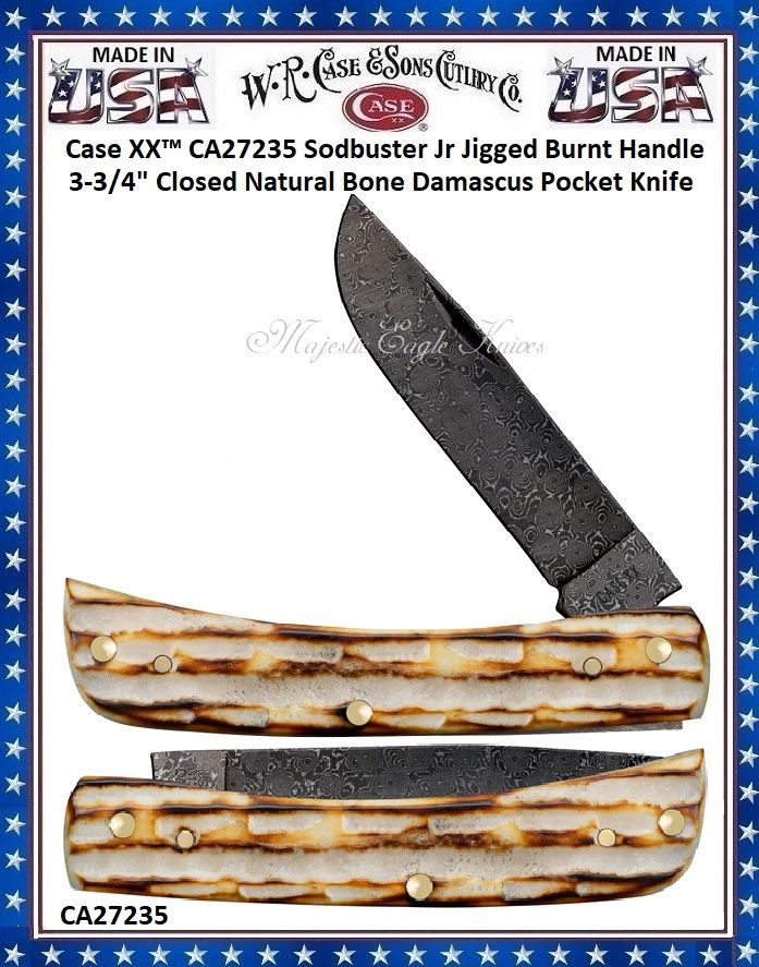 W.R. Case & Sons Cutlery Case XX CA27235 Sod Buster Jr Jigged Burnt Bone, Handle Damascus) Pocket Knife! This Classic American Case Sodbuster Jr is about 3-3/4 inches long (folded/closed) and weighs approximately 2.2 ounces. The handle is Deep Canyon jigged Burnt Natural Bone. This knife utilizes a 2 7/8" Skinner blade. Stamped with pattern number 6137 DAM, the blade material is Damascus Steel. This Sodbuster Jr is a professional-grade tool that comes with a Limited Lifetime Manufacturer's Warranty and is not designed nor intended to be used on or against humans. So, whether you're hunting for authentic cutlery to collect, a top quality knife to give as a gift, or a superior tool to use,
