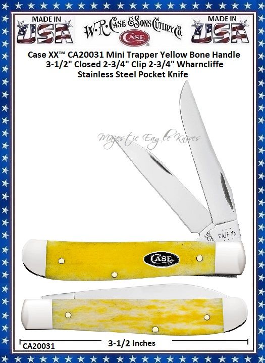 W.R. Case & Sons Cutlery CA20031 Case XX™ Mini Trapper Yellow Bone Handle 3-1/2" Closed 2-3/4" Clip 2-3/4" Wharncliffe Stainless Steel Pocket Knife! This classic American Case Mini Trapper is about 3-1/2 inches long (folded/closed) and weighs approximately 2.3 ounces. The handle is Yellow Bone with an Oval Nickel Silver Black Case Inlay shield. The bolsters are highly polished Nickel Silver. This knife utilizes a 2-3/4" Clip blade and 2-3/4" Wharncliffe blade. Stamped with pattern number 6207W SS, the blade material is Tru-Sharp Stainless Steel with a Mirror-polished finish. This Mini Trapper is a professional-grade tool that comes with a Limited Lifetime Manufacturer's Warranty and is not designed nor intended to be used on or against humans. So, whether you're hunting for authentic cutlery to collect, a top quality knife to give as a gift, or a superior tool to use,