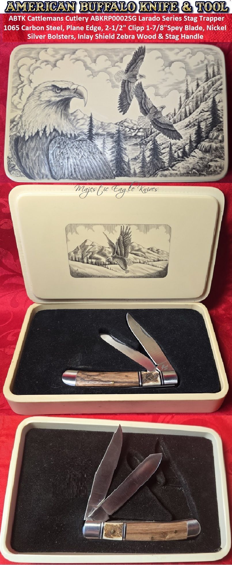 Cattleman Cutlery ABKRP0002SG Laredo Series Majestic Eagle Trapper, 3-1/4" Clip 3-1/4" Spey Blades 1065 Carbon Steel, Standard Edge Nickel silver bolsters, Inlay Shield. Tiger Wood & Stag Handle Pocket Knife! Model ABKRP0002SG Series 4-1/8" closed. Satin finished 1065 carbon steel clip and spey blades. Nickel silver bolster(s). Inlay shield. Laredo Series. Tiger Wood & Stag Handle Pocket Knife.