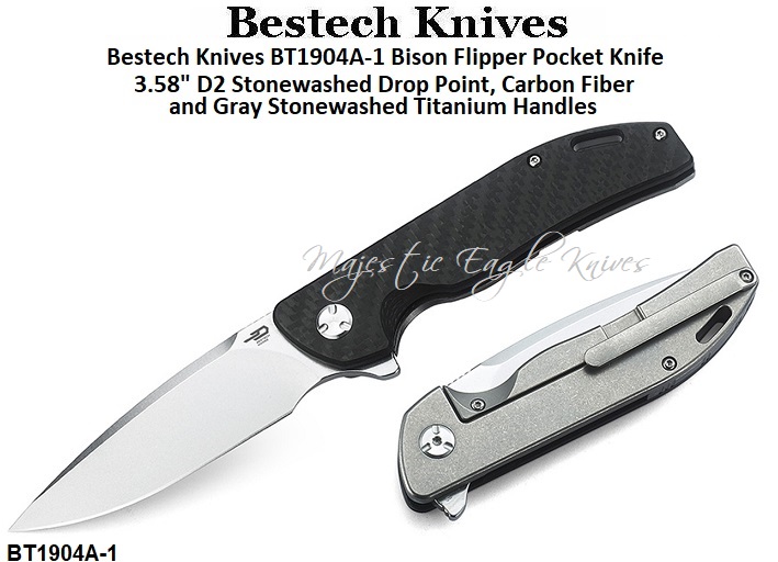 Bestech Knives BT1904A-1 Bison Flipper Pocket Knife 3.58" D2 Stonewashed Drop Point, Carbon Fiber and Gray Stonewashed Titanium Handles!The Bestech Bison is a mid-size flipper knife whose no-nonsense, streamlined design makes it a solid EDC knife. The 3.58" stonewashed drop point is made from sturdy D2 tool steel and holds up to the wear and tear of daily use. It deploys quickly and easily thanks to the ceramic ball bearings in the pivot assembly. The handles are made from carbon fiber and titanium and have a solid feel while still remaining lightweight. The Bison includes a titanium pocket clip and is a great choice for your next EDC knife.