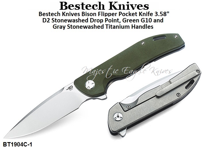 Bestech Knives BT1904C-1 Bison Flipper Pocket Knife 3.58" D2 Black Stonewashed Drop Point, Green G10 and Black Stonewashed Titanium Handles!The Bestech Bison is a mid-size flipper knife whose no-nonsense, streamlined design makes it a solid EDC knife. The 3.58" stonewashed drop point is made from sturdy D2 tool steel and holds up to the wear and tear of daily use. It deploys quickly and easily thanks to the ceramic ball bearings in the pivot assembly. The handles are made from G10 and titanium and have a solid feel while still remaining lightweight. The Bison includes a titanium pocket clip and is a great choice for your next EDC knife.