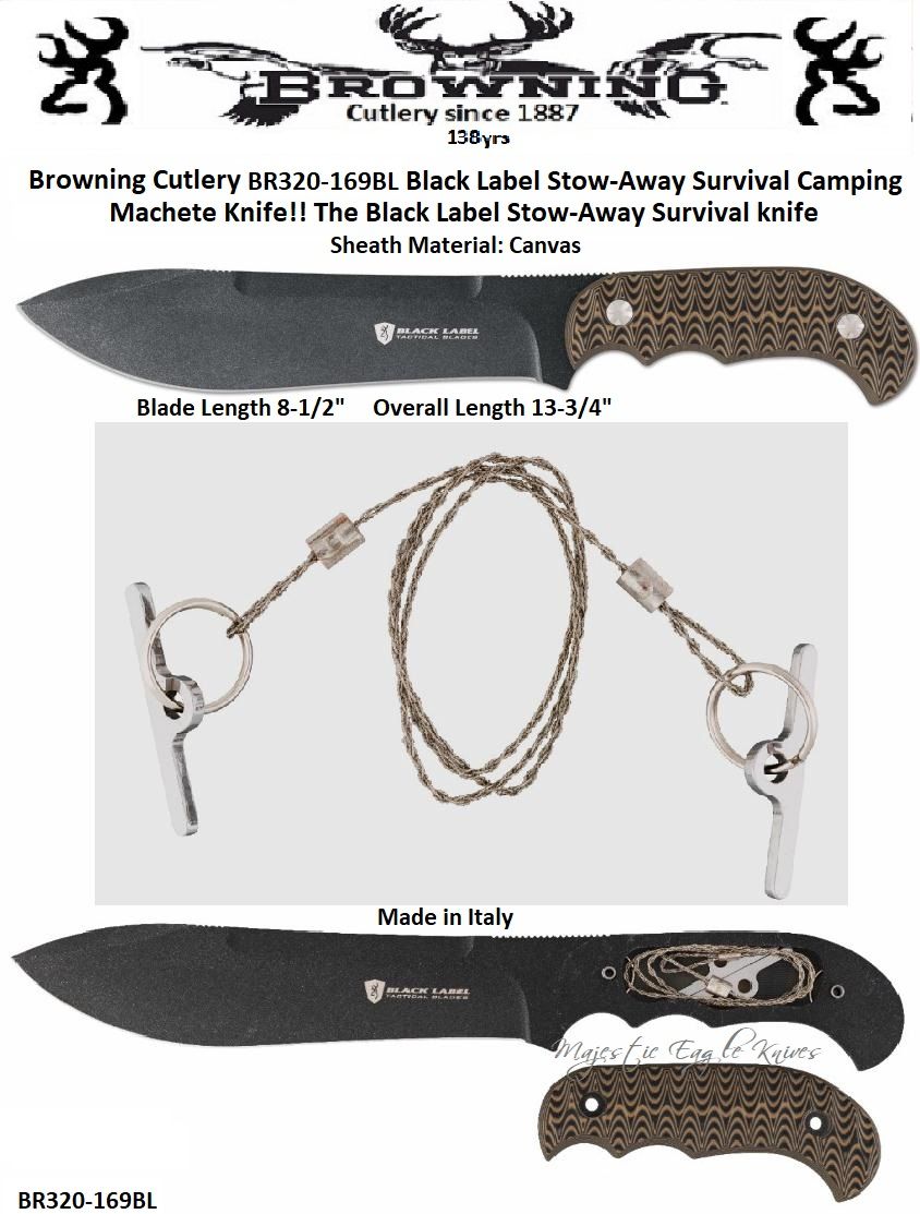 Browning Cutlery BR320169BL Black Label Stow-Away Survival Camping Machete Knife!! The Black Label Stow-Away Survival knife is built to take the place of several common camp tools. The heavy-duty full tang construction and versatile blade shape make chopping limbs and other camp chores a breeze. Kindling is easily split with the edge of the blade spine. Remove the grippy G-10 handle scales to access the T-handled diamond wire saw and you're ready to tackle tree limbs. An included knife sharpener keeps the Stow-Away Survival honed and ready for action at all time.