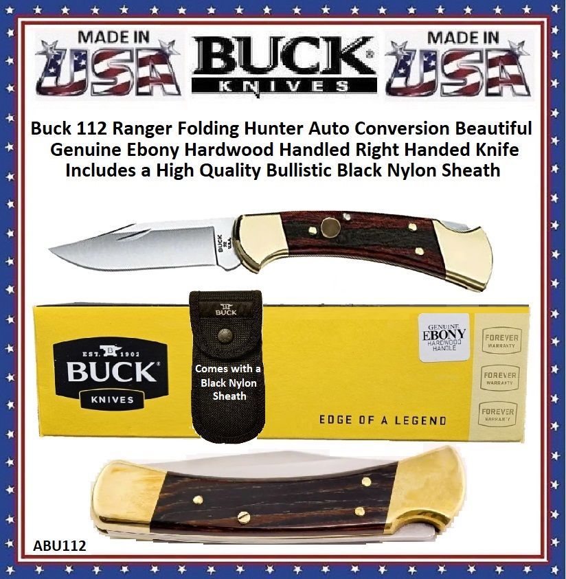 Buck Automatic's > Buck 112 Ranger Auto Conversion Folding Hunter Beautiful Genuine Ebony Hardwood Handled Right-hand Knife & Black Ballistic Nylon/Sheath