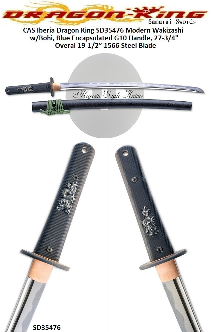 CAS Iberia Dragon King SD35476 Modern Wakizashi w/Bohi, Blue Encapsulated G10 Handle, 27-3/4" Overal 19-1/2” 1566 Steel Blade! Due to the popularity of our Modern Series from Dragon King and the demand for versions with bo-hi, we proudly present the next versions of this popular genre. Keeping all the specifications of their predecessors, this new katana, wakizashi and tanto series will feature a dragon motif.Our Modern Series represents a contemporary interpretation of what the renowned Samurai would look like in our time. Using the best of the latest technological materials, the low maintenance of this katana is perfect for the urban warrior of today. The humble attributes of this katana bely its true strength and resilience. The differentially tempered 20” 1566 steel blade features a real hamon line with a copper habaki and seppa. The tsuka encapsulates the tang in textured G10 and is dual pinned for a secure grip which is unremovable. The silver menuki on the tsuka are dragons which are embedded in the handle. The textured black saya features an olive paracord sageo around a polymer kurikata and kojiri. The Modern Katana also has the Modern Tanto as a companion piece to complete your modern warrior collection.Please note: the katana, wakizashi or tanto’s sageo (cord) on the saya (scabbard) may not be wrapped as pictured.Made by Dragon King.