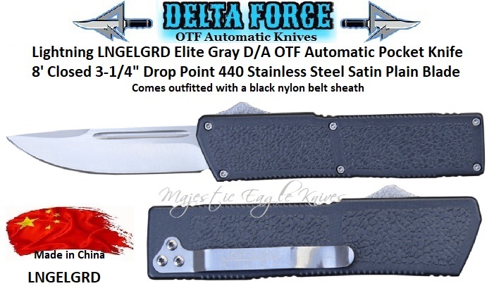 Delta Force LNGELGRD Lightning D/A OTF Gray Aluminum Alloy Handle Drop Point Automatic Pocket Knife. 8" Overall 3-1/4" 440 Stainless Plain Blade w/Sheath!This Lightning Elite D/A OTF action packs a big punch but doesn't pack a punch on your wallet. The dual action sliding button has great updated action that makes it smoother and faster opening and closing the blade. The drop point blade has a two-tone finish and is effective and very efficient. This model has an gray powder coated aluminum alloy handle with a textured surface for a superior grip. The firing button is mounted on the side, making the Lightning slim and easy to carry