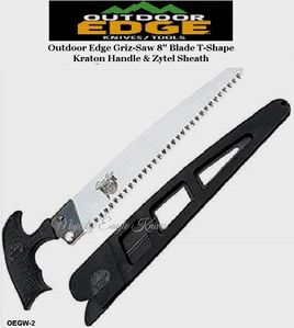Outdoor Edge Knives OEGW-2 Outdoor Edge Griz-Saw Triple-Ground DiamondCut 8" Blade, T shaped Rubberized TPR Handle & Zytel Sheath! The Griz-Saw’s triple-ground diamond cut blade easily penetrates tough game bone and tree limbs. The T-shaped handle allows straight wrist cutting from any angle and enables a secure lock-on grip, even when wet. The Griz-Saw comes complete with a quick-release Zytel sheath with swivel-clip attachment.