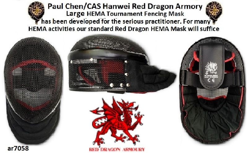 Paul Chen/Hanwei AR7058 Tournament HEMA Fencing Mask Large by Red Dragon Armory! Our Red Dragon HEMA Tournament Fencing Mask has been developed for the serious practitioner. For many HEMA activities our standard Red Dragon HEMA Mask will suffice, but if you are looking for something with a higher level of protection, or looking to fight in tournaments, our Red Dragon Tournament Fencing Mask will perfectly suit your needs. This CEN 2 mask comes in HEMA Black and features a 1600 newton bib, removable washable liner (hand-wash only) and heavy-duty adjustable strap. Available in Small, Medium, Large and