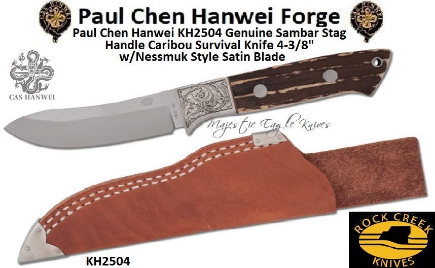 Paul Chen Hanwei KH2504 Rock Creek Full Taper Tangs Hunter Genuine Sambar Stag Handle w/4-3/8" Nessmuk Style Satin Blade Bark-Tanned Leather Sheath! Rock Creek Utility/Survival Knife with Drop Point Blade. Our top-quality full-tang hunters feature forged blades in HWS-1K with full taper tangs. Edge hardness is 58-60HRc. The handle scales are genuine Sambar stag and the stainless steel guards feature electroformed scroll engraving. Sheath construction is bark-tanned leather with stainless steel reinforcing at the wear points. Made by Hanwei
