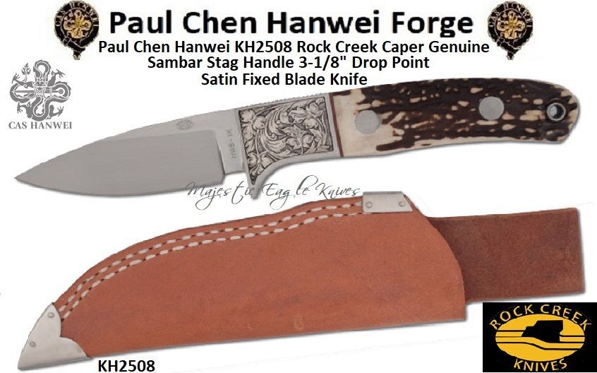 Paul Chen Hanwei KH2508 Rock Creek Full Taper Tangs Caper Genuine Sambar Stag Handle 3-1/8" Drop Point Satin Fixed Blade Knife! Our top-quality full-tang hunters feature forged blades in HWS-1K with full taper tangs. Edge hardness is 58-60HRc. The handle scales are genuine Sambar stag and the stainless steel guards feature electroformed scroll engraving. Sheath construction is bark-tanned leather with stainless steel reinforcing at the wear points Made by Hanwei