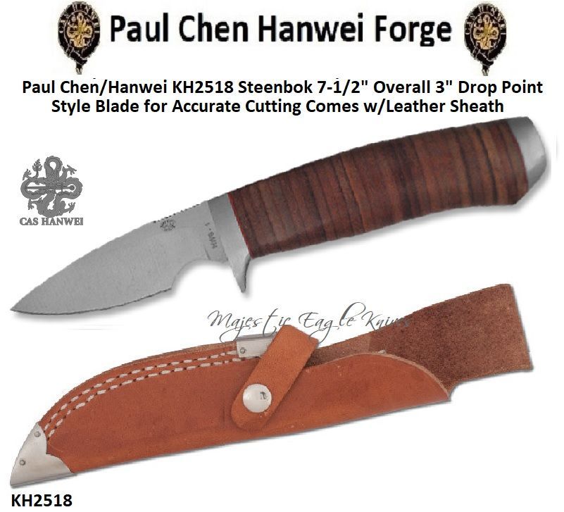 Paul Chen/Hanwei KH2518 Steenbok 7-1/2" Overall 3" Drop Point Style Blade for Accurate Cutting Comes w/Leather Sheath! Forged from a high-alloy steel (HWS-1K) proprietary to Hanwei, with an edge hardness of 58-60HRc and excellent corrosion resistance, edge-holding and ease of sharpening. The blade thickness is 3/16”, and the blade is flat ground. An aggressive thumb grip is provided on the back of the blade and a finger groove is provided at the choil for blade control. The Tang is very substantial, terminating in a short thread at the pommel. The stacked-leather handle employs bark-tanned leather and is secured by a sleeve nut at the pommel. The guard and pommel are investment cast in stainless steel.Sheath is made of bark-tanned leather with stainless steel reinforcing at the wear points and is pouch-type.