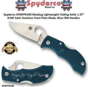 Spyderco Cutlery SPMFPK390 Manbug Lightweight Folding Knife 1.97" K390 Satin Stainless Steel Plain Blade, Blue FRN Handles!Spyderco has always taken great pride in its efforts to push the envelope of performance by offering exotic blade steels in their knives. With that spirit in mind, they are proud to announce that they are offering a number of best-selling models with blades crafted from K390. Manufactured by Bohler-Uddeholm, K390 MICROCLEAN is a state-of-the-art cold work tool steel produced by the particle metallurgy process. Its advanced alloy mix was specifically developed to provide the extreme wear resistance and high compressive strength needed in industrial cutting, blanking, and punching operations. Despite its toughness, its exceptionally fine, homogeneous microstructure also makes it readily machinable and easy to heat treat. Collectively, these qualities make K390 an outstanding blade material for true steel connoisseurs. Spyderco is proud to feature it on some of their most popular models, which are also distinguished with distinctive blue-colored handles