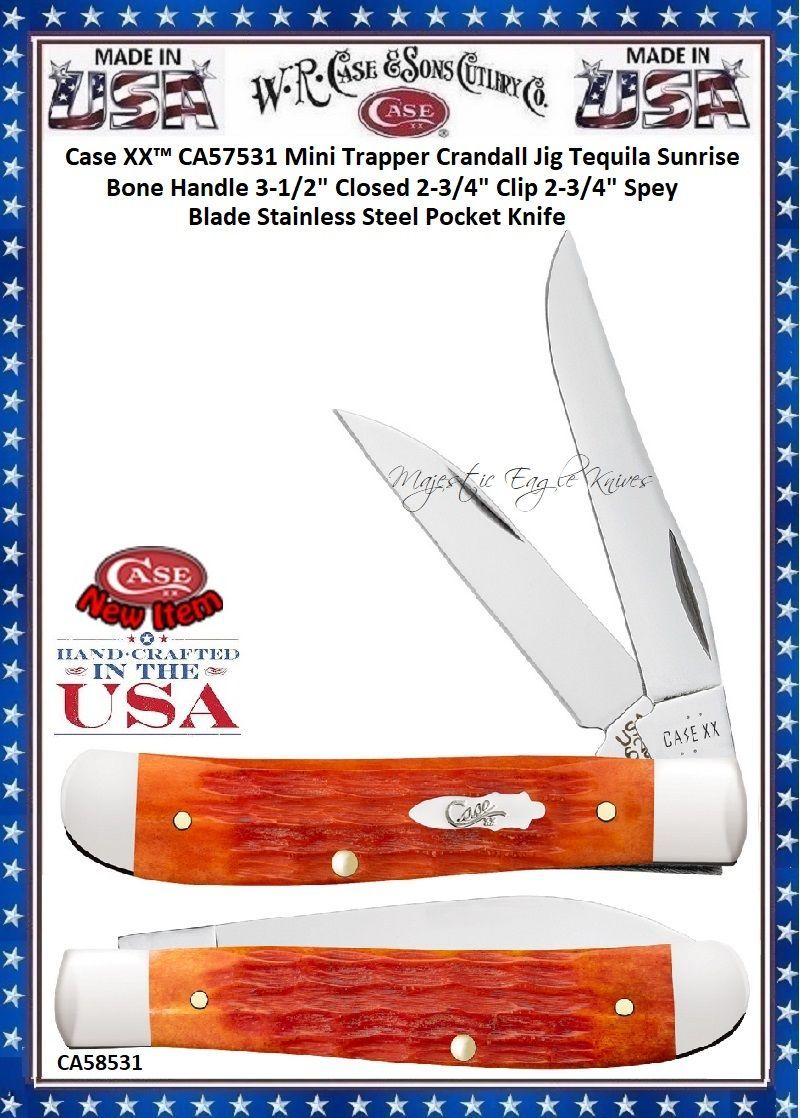 W.R. Case-Sons Cutlery CA57531 Case XX™ Minni Trapper Crandall Jig Tequila Sunrise Bone Handle 3-1/2" Closed 2-3/4" Clip 2-3/4" Spey Blade Stainless Steel Pocket Knife! This Classic American Case Mini Trapper is 3-1/2 inches long Closed and weighs approximately 2.5 ounces. The handle is Crandall jigged Tequila Sunrise Bone with a Nickel Silver Bombshell Script Inlay shield. The bolsters are Highly polished Nickel Silver. This knife has a 2-3/4" Clip blade and 2-3/4" Spey blade. Stamped with pattern number 6207 SS, the blade material is Tru-Sharp Surgical Stainless Steel with a mirror-polished finish. This Mini Trapper is a professional-grade tool that comes with a Limited Lifetime Manufacturer's Warranty. So, whether you're looking for an authentic cutlery to collect, a top quality knife to give as a gift, or a superior tool to use,