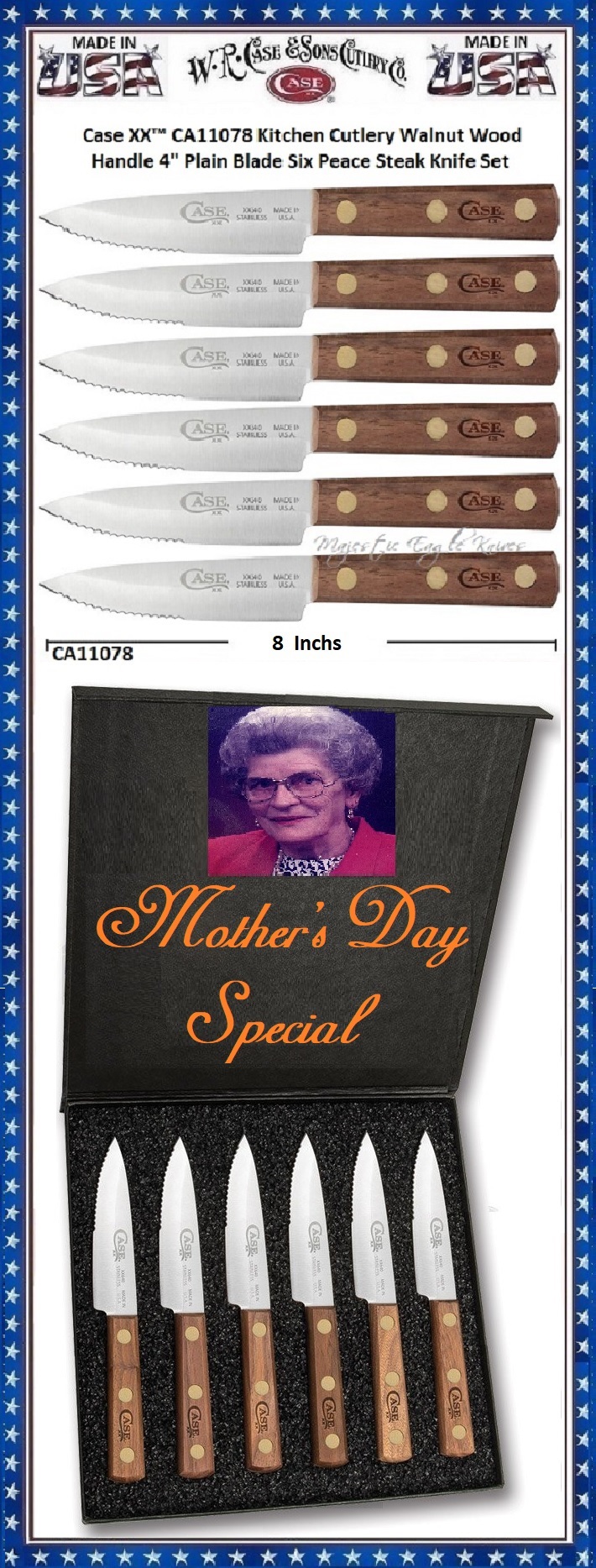 W.R. Case & Sons Cutlery CA11078! This classic American Case 6-piece Steak Knife Set comes with a Limited Lifetime Manufacturer's Warranty. The blade material is Stainless Steel with Satin finish. The handles are smooth Walnut Wood with Brass rivets. This 6-Piece Set comes with a Magnetic Presentation Box So, whether you're hunting for authentic cutlery to collect or top quality knives to give as a gift,