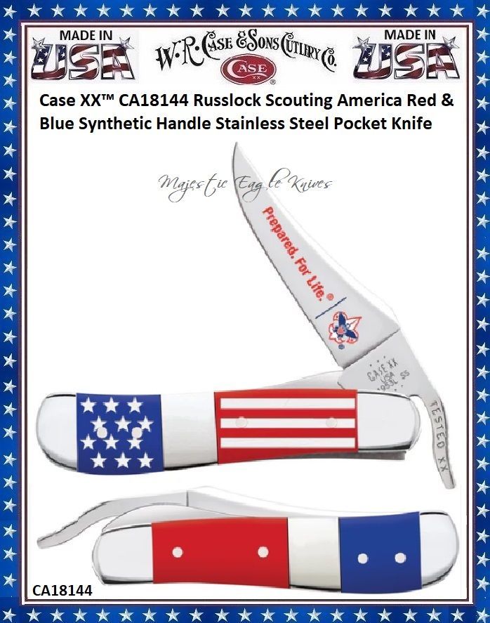 W.R. Case & Sons CA18144 Case XX™ Russlock Scouting America Red & Blue Synthetic Handle 4-1/8" Closed Stainless Steel Pocket Knife! T his classic American Case Russlock is about 4 1/8 inches long (folded/closed) and weighs approximately 2.5 ounces. The handle is Red & Blue Synthetic with a Nickel Silver Center Bolster and engraved with White Stars & Stripes. The bolsters are Highly polished Nickel Silver. This knife utilizes a 2 3/4" Locking Clip(W/Thumb Lever) blade. Stamped with pattern number 41953L SS, the blade material is Tru-Sharp Surgical Stainless Steel with a mirror-polished finish and etched with 'Scouting America' logo. This Russlock is a professional-grade tool that comes with a Limited Lifetime Manufacturer's Warranty and is not designed nor intended to be used on or against humans. So, whether you're hunting for authentic cutlery to collect, a top quality knife to give as a gift, or a superior tool to use, Specifications  CA18144 RUSSLOCK SCOUTING AMERI Knife Pattern Russlock (41953L SS) Knife Weight 2.5 Ounces (70.8 Grams) Knife Length 4 1/8 Inches (10.5 cm) Folded Blade Type 2 3/4" Locking Clip Blade Material Tru-Sharp Surgical Stainless Steel Handle Material Red & Blue Synthetic