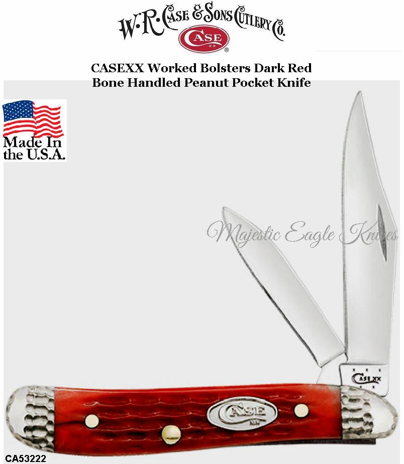 W.R. Case & Son's Cutlery CA53222 CASEXX Worked Bolsters Dark Red Bone Handled Peanut Pocket Knife!This classic American Case Peanut is 2-7/8 inches long closed and weighs 1.2 ounces. The handle is jigged Dark Red Bone with an Oval Nickel Silver Cast Inlay shield. The worked bolsters are engraved Nickel Silver. This knife has a 2-1/8" Clip blade and 1-1/2" Pen blade. Stamped with pattern number 6220 SS, the blade material is Tru-sharp Surgical Stainless Steel. The knife is presented with Black Velvet Box. This Peanut is a professional-grade tool that comes with a Limited Lifetime Manufacturer's Warranty. So, whether you're hunting for authentic cutlery to collect, a top quality knife to give as a gift, or a superior tool to use, Don't let this Treasure get away! Manufacturing knives in the USA since 1889, W.R. Case & Sons Cutlery Company continues to dominate as an American cutlery classic. This is because Case Cutlery still relies on old-fashioned but proven techniques for unmatched quality, craftsmanship and attention to detail. Using only high quality materials, every Case XX knife displays durability AND personality. Handmade Case knives still remain the most treasured and sought after by users and collectors alike.