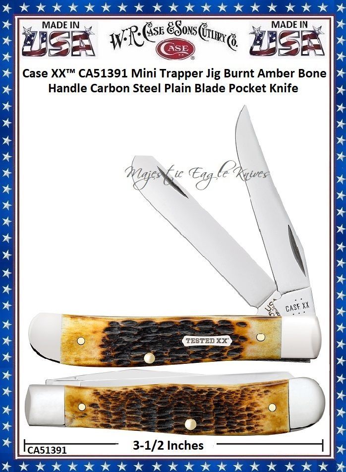 W.R. Case & Sons Cutlery CA51391 Case XX™ Mini Trapper Jig Burnt Amber Bone Handle Carbon Steel Pocket Knife! This classic American Case Mini Trapper is about 3 1/2 inches long (folded/closed) and weighs approximately 2.7 ounces. The handle is Peachseed jigged Burnt Amber Bone with a Nickel Silver Dogbone Tested XX Inlay shield. The bolsters are Highly polished Nickel Silver. This knife utilizes a 2 3/4" Clip blade and 2 3/4" Spey blade. Stamped with pattern number 6207 CS, the blade material is 1095 Carbon Steel with a mirror-polished finish. Note: Carbon Steel is generally harder than stainless steel, this allows the blade to hold a sharper edge, longer. However, Carbon Steel will corrode/rust if it's not cleaned and oiled regularly. This Mini Trapper is a professional-grade tool that comes with a Limited Lifetime Manufacturer's Warranty and is not designed nor intended to be used on or against humans. So, whether you're hunting for authentic cutlery to collect, a top quality knife to give as a gift, or a superior tool to use,