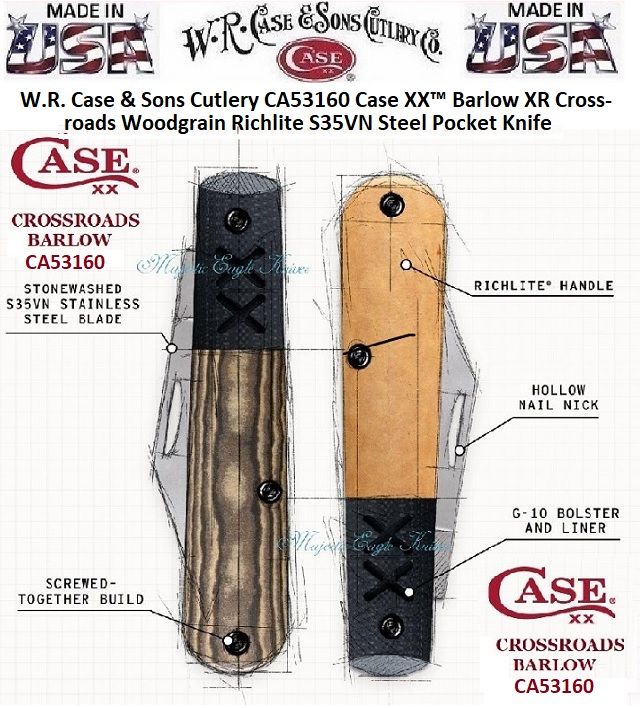 W.R. Case & Sons Cutlery CA53160 Case XX™ Barlow XR Crossroads Woodgrain Richlite S35VN Steel Pocket Knife! This Classic American Case Barlow XR is about 3-3/8 inches long (folded/closed) and weighs approximately 2.0 ounces. The handle is Woodgrain Richlite with Black Torx screws. The bolsters and liners are Black G10. This knife utilizes a 2-1/2" Clip Point blade with a hollow nail nick. Stamped with pattern number XR101009 1/2 S35VN, the blade material is CPM S35VN Stainless Steel with a Stonewashed finish. This Barlow XR is a professional-grade tool that comes with a Limited Lifetime Manufacturer's Warranty and is not designed nor intended to be used on or against humans. So, whether you're hunting for authentic cutlery to collect, a top quality knife to give as a gift, or a superior tool to use,