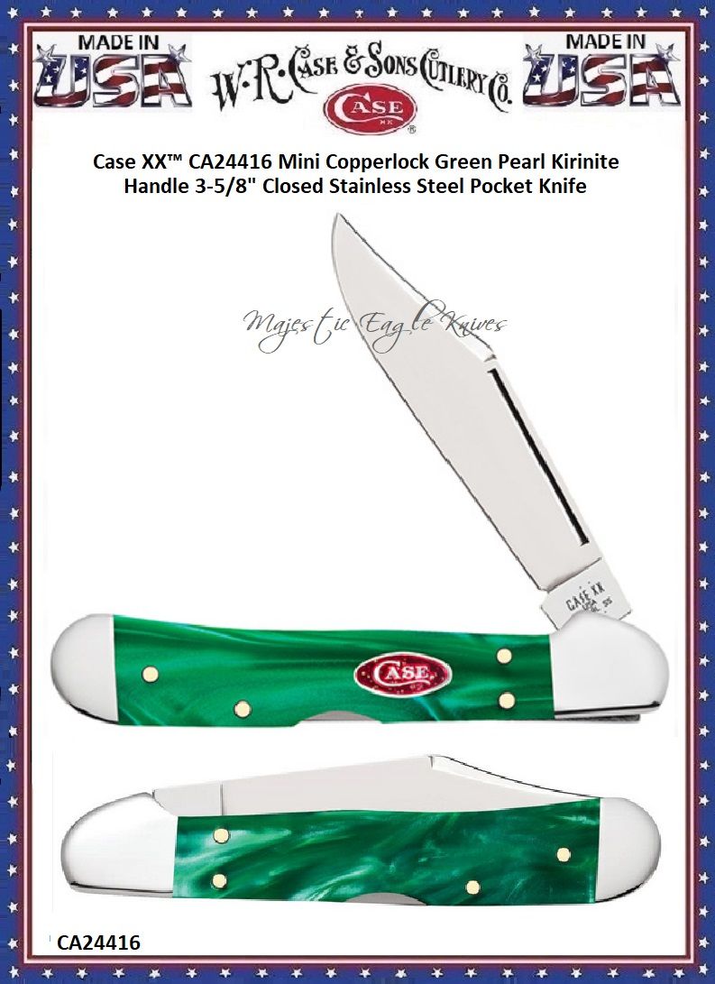W.R. Case & Sons Cutlery CA24416 Case XX™ Mini Copperlock Green Pearl Kirinite Handle 3-5/8" Closed Stainless Pocket Knife! This classic American Case Mini Copperlock is about 3 5/8 inches long (folded/closed) and weighs approximately 2.3 ounces. The handle is smooth Green Pearl Kirinite Handla with a Oval Red SparXX Script Inlay shield. The bolsters are Highly polished Nickel Silver. This knife utilizes a 2 1/2" Clip blade and 1 7/8" Pen blade. Stamped with pattern number 102032 SS, the blade material is Tru-Sharp Surgical Stainless Steel with a mirror-polished finish. This Mini Copperlock is a professional-grade tool that comes with a Limited Lifetime Manufacturer's Warranty and is not designed nor intended to be used on or against humans. So, whether you're hunting for authentic cutlery to collect, a top quality knife to give as a gift, or a superior tool to use,
