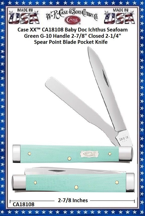 W.R. Case & Sons Cutlery CA18108 Case XX™ Baby Doc Ichthus Seafoam Green G-10 Handle 2-7/8" Closed 2-1/4" Spear Point Blade Pocket Knife! This classic American Case Baby Doc is about 2 7/8 inches long (folded/closed) and weighs approximately 1.2 ounces. The handle is smooth Seafoam Green G-10 with a Nickel Silver Lobed Ichthus Inlay shield. The bolsters are Highly polished Nickel Silver. This knife utilizes a 2 1/4" Spear point blade and 2 1/4" Spatula blade. Stamped with pattern number 10282SP SS, the blade material is Tru-Sharp Surgical Stainless Steel with a mirror-polished finish. This Baby Doc is a professional-grade tool that comes with a Limited Lifetime Manufacturer's Warranty and is not designed nor intended to be used on or against humans. So, whether you're hunting for authentic cutlery to collect, a top quality knife to give as a gift, or a superior tool to use,
