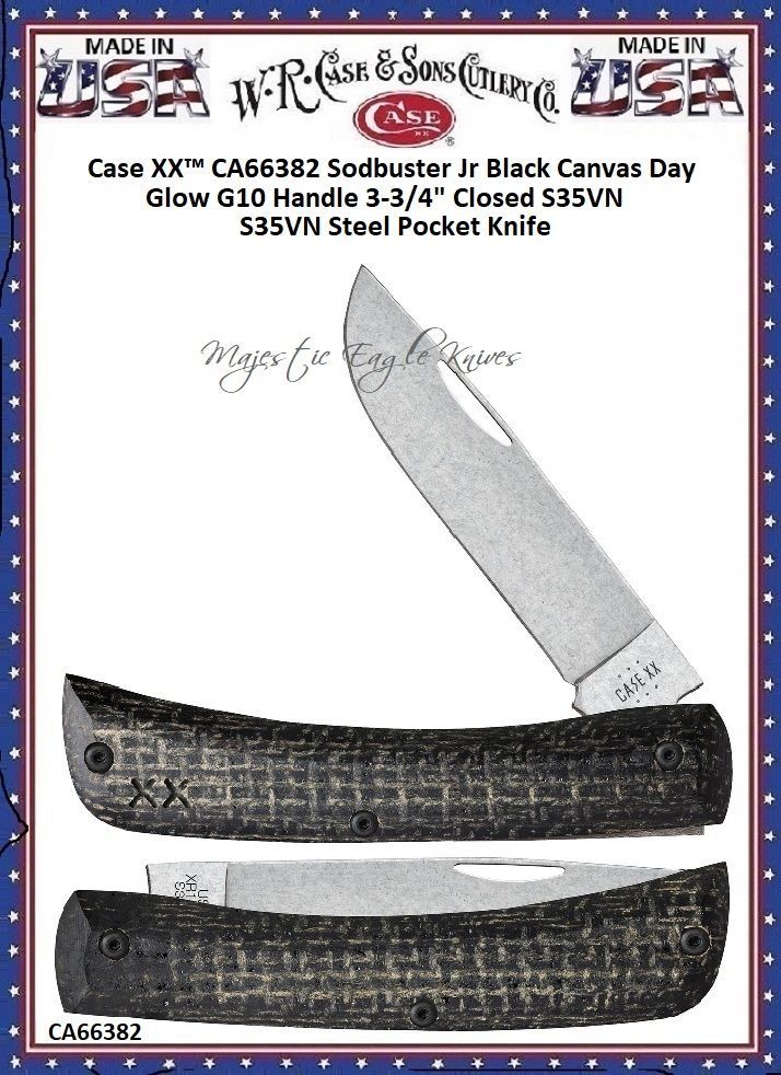 W.R. Case & Son's Cutlery CA66382 Case XX™ Sodbuster Jr Black Canvas Day Glow G10 Handle 3-3/4" Closed S35VN Steel Pocket Knife! This classic American Case Sodbuster Jr is about 3 3/4 inches long (folded/closed) and weighs approximately 2.0 ounces. The handle is smooth Black Canvas Laminate & Day Glow G10 liners engraved with XX logo. This knife utilizes a 2 7/8" Skinner blade. Stamped with pattern number XR7137 S35VN, the blade material is CPM S35VN Stainless Steel with a Stonewashed finish. This Sodbuster Jr is a professional-grade tool that comes with a Limited Lifetime Manufacturer's Warranty and is not designed nor intended to be used on or against humans. So, whether you're hunting for authentic cutlery to collect, a top quality knife to give as a gift, CA66382 SODBUSTER G10 BLACK Knife Pattern Sodbuster Jr (XR7137 S35VN) Knife Weight 2.0 Ounces (56.7 Grams) Knife Length 3 3/4 Inches (9.5 cm) Folded Blade Type 2 7/8" Skinner Blade Material CPM S35VN Stainless Steel Handle Material Black Canvas Laminate & Day Glow G10