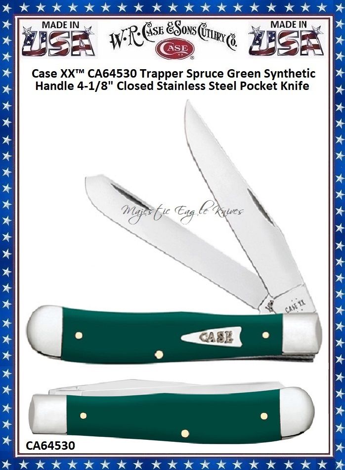 W.R. Case & Son's Cutlery Case XX™ CA64530 Trapper Spruce Green Synthetic Handle 4-1/8" Closed Stainless Steel Blade Pocket Knife! This classic American Case Trapper is about 4 1/8 inches long (folded/closed) and weighs approximately 3.8 ounces. The handle is smooth Spruce Green Synthetic with a Nickel Silver Case Arrowhead Inlay shield. The bolsters are Highly polished Nickel Silver. This knife utilizes a 3 1/4" Clip blade and 3 1/4" Spey blade. Stamped with pattern number 4254 SS, the blade material is Tru-Sharp Surgical Stainless Steel with a mirror-polished finish. This Trapper is a professional-grade tool that comes with a Limited Lifetime Manufacturer's Warranty and is not designed nor intended to be used on or against humans. So, whether you're hunting for authentic cutlery to collect, a top quality knife to give as a gift, or a superior tool to use,