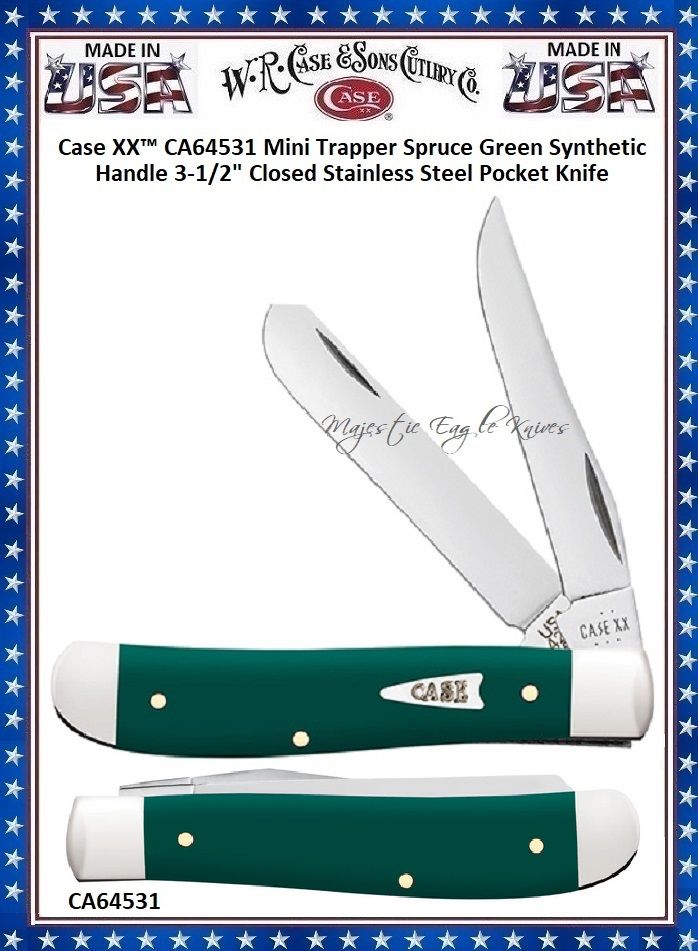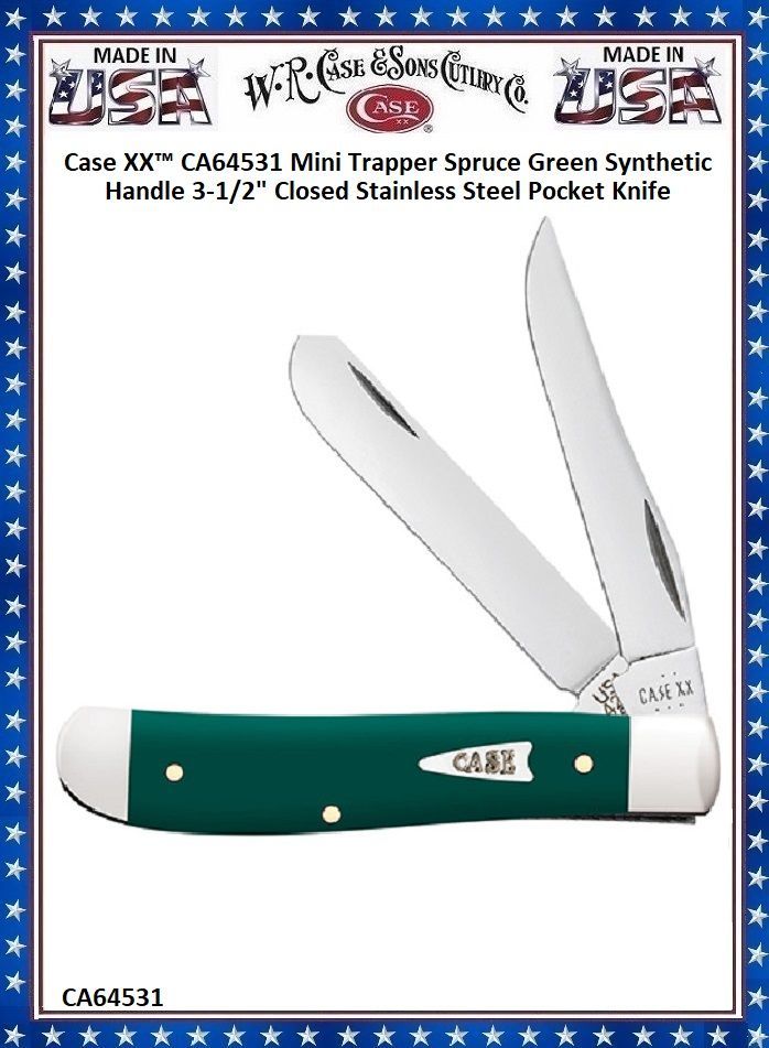 W.R. Case & Son's Cutlery CA64531 Case XX™ Mini Trapper Spruce Green Synthetic Handle 4-1/8" Closed Stainless Steel Blade Pocket Knife! This classic American Case Mini Trapper is about 3 1/2 inches long (folded/closed) and weighs approximately 2.5 ounces. The handle is smooth Spruce Green Synthetic with a Nickel Silver Case Arrowhead Inlay shield. The bolsters are Highly polished Nickel Silver. This knife utilizes a 2 3/4" Clip blade and 2 3/4" Spey blade. Stamped with pattern number 4207 SS, the blade material is Tru-Sharp Surgical Stainless Steel with a mirror-polished finish. This Mini Trapper is a professional-grade tool that comes with a Limited Lifetime Manufacturer's Warranty and is not designed nor intended to be used on or against humans. So, whether you're hunting for authentic cutlery to collect, a top quality knife to give as a gift, or a superior tool to use