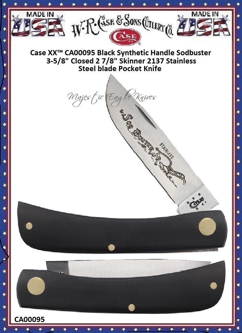 W.R. Case & Son's Cutlery CA00095 Case XX™  Sodbuster Jr. Black Synthetic 3-5/8" Closed Handle Pocket Knife! This classic American Case Sodbuster Jr. is about 3 5/8 inches long (folded/closed) and weighs approximately 2.1 ounces. The handle is Black Synthetic. This knife utilizes a 2 7/8" Skinner blade. Stamped with pattern number 2137 SS, the blade is highly polished Tru-Sharp Surgical Stainless Steel with Stainless Sod Buster and Plow etching. This Sodbuster Jr. is a professional-grade tool that comes with a Limited Lifetime Manufacturer's Warranty and is not designed nor intended to be used on or against humans. So, whether you're hunting for authentic cutlery to collect, a top quality knife to give as a gift, or a superior tool to use,