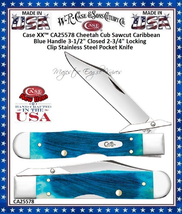 W.R. Case & Sons Cutlery CA25578 Case XX™ Cheetah Cub Sawcut Caribbean Blue Bone Handle 3-1/2 Closed 2-3/4" Locking Clip Stainless Steel Pocket Knife! This classic American Case Barlow is about 3 3/8 inches long (folded/closed) and weighs approximately 1.9 ounces. The handle is Sawcut Jigged Caribbean Blue Bone with a Nickel Silver Oval Script Inlay shield. The bolsters are Highly polished Nickel Silver. This knife utilizes a 2 1/2" Locking Clip blade and 1 7/8'' Pen blade. Stamped with pattern number 62009 1/2 SS, the blade material is Tru-Sharp Surgical Stainless Steel with a mirror-polished finish. This Barlow is a professional-grade tool that comes with a Limited Lifetime Manufacturer's Warranty and is not designed nor intended to be used on or against humans. So, whether you're hunting for authentic cutlery to collect, a top quality knife to give as a gift, or a superior tool to use,