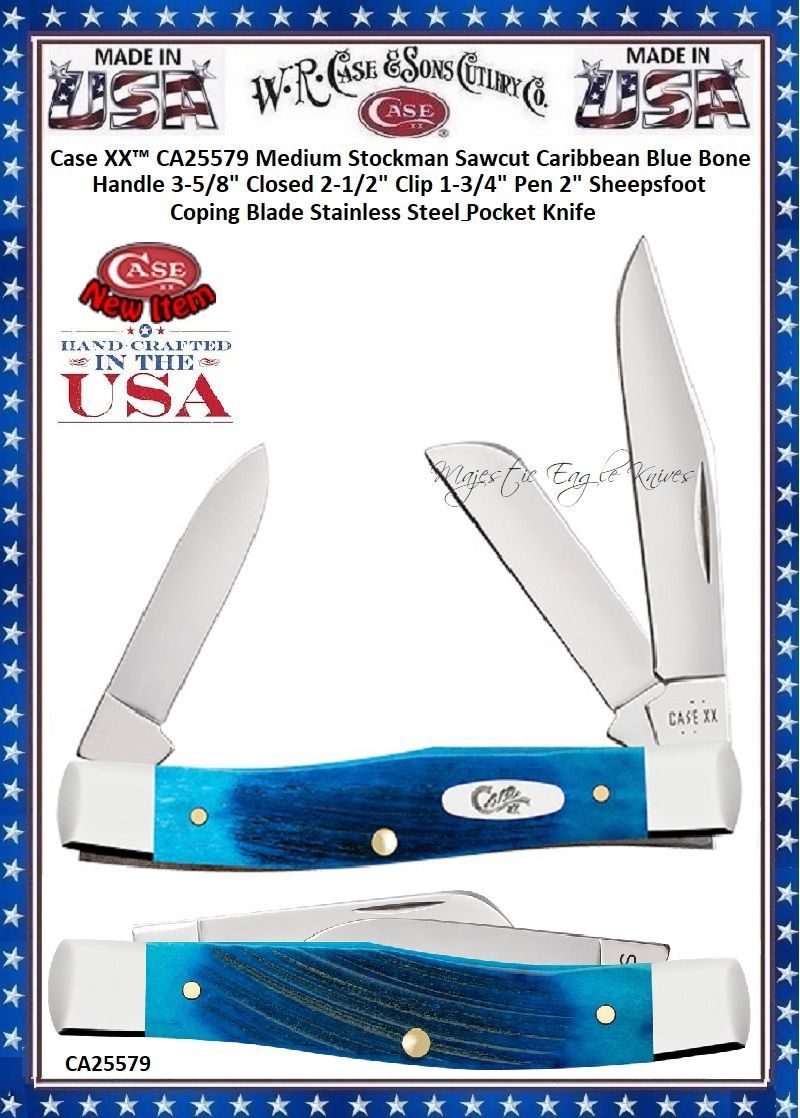 W.R. Case & Sons Cutlery CA25579 Case XX™ Medium Stockman Sawcut Caribbean Blue Bone Handle 3-5/8" Closed 2-1/2" Clip 1-3/4" Pen 2" Sheepsfoot Coping Blade Stainless Steel Pocket Knife! This Classic American Case Barlow is about 3-3/8 inches long (folded/closed) and weighs 1.9 ounces. The handle is Sawcut Jigged Caribbean Blue Bone with a Nickel Silver Oval Script Inlay shield. The bolsters are Highly polished Nickel Silver. This knife has a 2-1/2" Locking Clip blade and 1-7/8'' Pen blade. Stamped with pattern number 62009 1/2 SS, the blade material is Tru-Sharp Surgical Stainless Steel with a mirror-polished finish. This Barlow is a professional-grade tool that comes with a Limited Lifetime Manufacturer's Warranty. So, whether you're looking for authentic cutlery to collect, a top quality knife to give as a gift, or a superior tool to use,