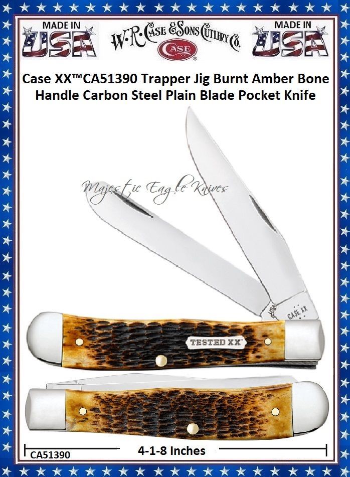 W.R. Case & Sons Cutlery CA51390 Case XX™ Trapper Jig Burnt Amber Bone Handle Carbon Steel Pocket Knife! This classic American Case Trapper is about 4 1/8 inches long (folded/closed) and weighs approximately 3.8 ounces. The handle is Peachseed jigged Burnt Amber Bone with a Nickel Silver Dogbone Tested XX Inlay shield. The bolsters are Highly polished Nickel Silver. This knife utilizes a 3 1/4" Clip blade and 3 1/4" Spey blade. Stamped with pattern number 6254 CS, the blade material is 1095 Carbon Steel with a mirror-polished finish. Note: Carbon Steel is generally harder than stainless steel, this allows the blade to hold a sharper edge, longer. However, Carbon Steel will corrode/rust if it's not cleaned and oiled regularly. This Trapper is a professional-grade tool that comes with a Limited Lifetime Manufacturer's Warranty and is not designed nor intended to be used on or against humans. So, whether you're hunting for authentic cutlery to collect, a top quality knife to give as a gift, or a superior tool to use,